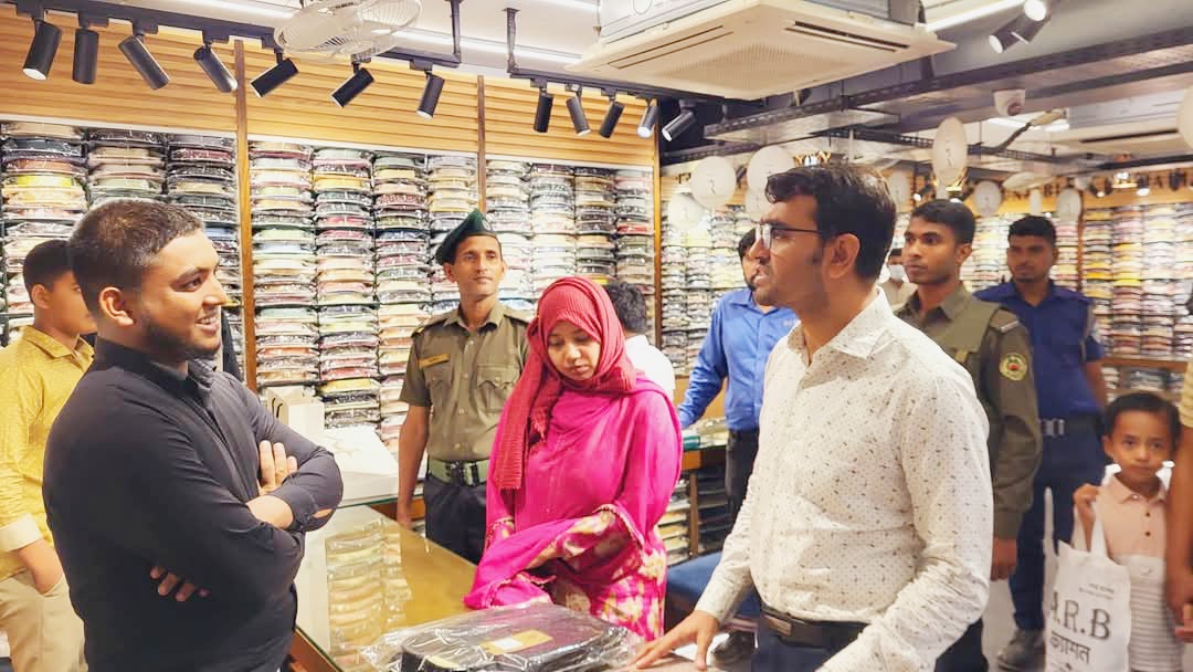 রায়হান সিকদারঃ পবিত্র রমজান মাস উপলক্ষে খাদ্য নিরাপত্তা নিশ্চিত ও ঈদের বাজারে ভোক্তার অধিকার নিশ্চিতকল্পে জামা,জুতা,থ্রিপিছ,লুঙ্গি, প্যান্ট ইত্যাদির দোকানে বাজার