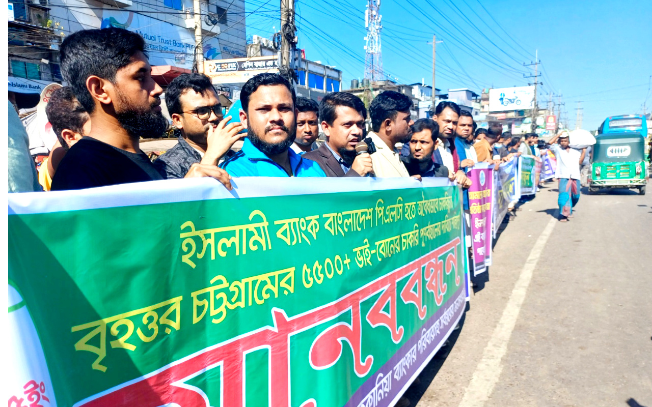 ইসলামী ব্যাংক থেকে চাকরিচ্যুত কর্মকর্তাদের চাকরিতে পূণর্বহালের দাবিতে লোহাগাড়ায় মানববন্ধন