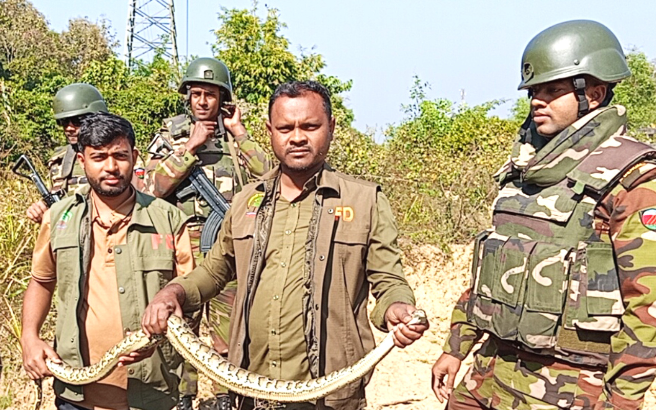 বন ছেড়ে লোকালয়ে সাড়ে চারফুট লম্বা অজগর সাপ,চুনতি অভয়ারণ্যে অজগর অবমুক্ত