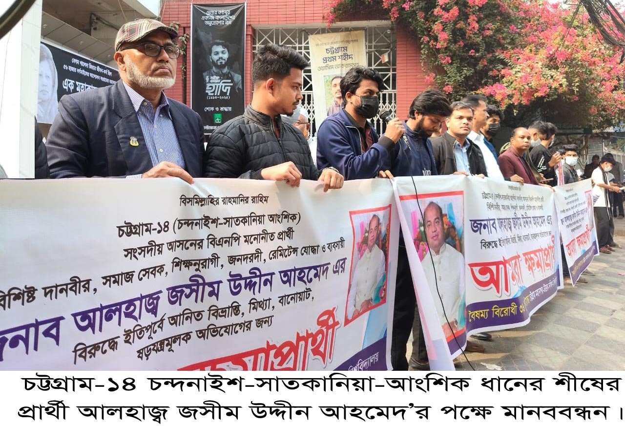 অপপ্রচারের প্রতিবাদে চট্টগ্রাম-১৪ আসনে ধানের শীষের প্রার্থীর জসীম উদ্দীনের পক্ষে মানববন্ধন